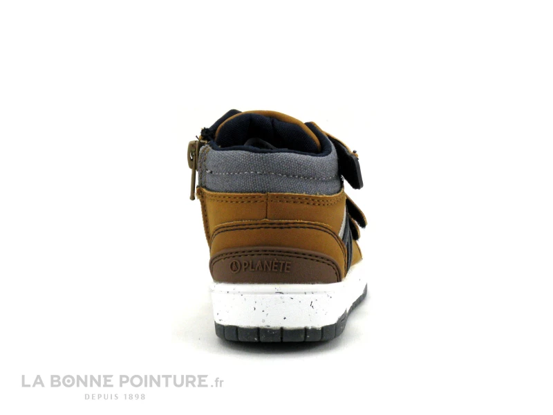 Ce bottillon garçon éco-responsables Alma Planete Eckos est en simili cuir marron clair (camel), avec une toile grise sur le haut.