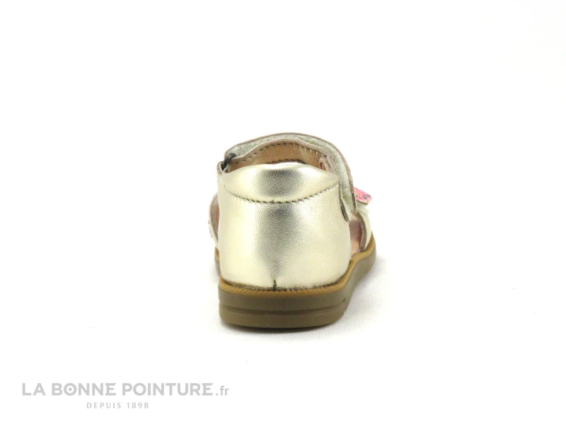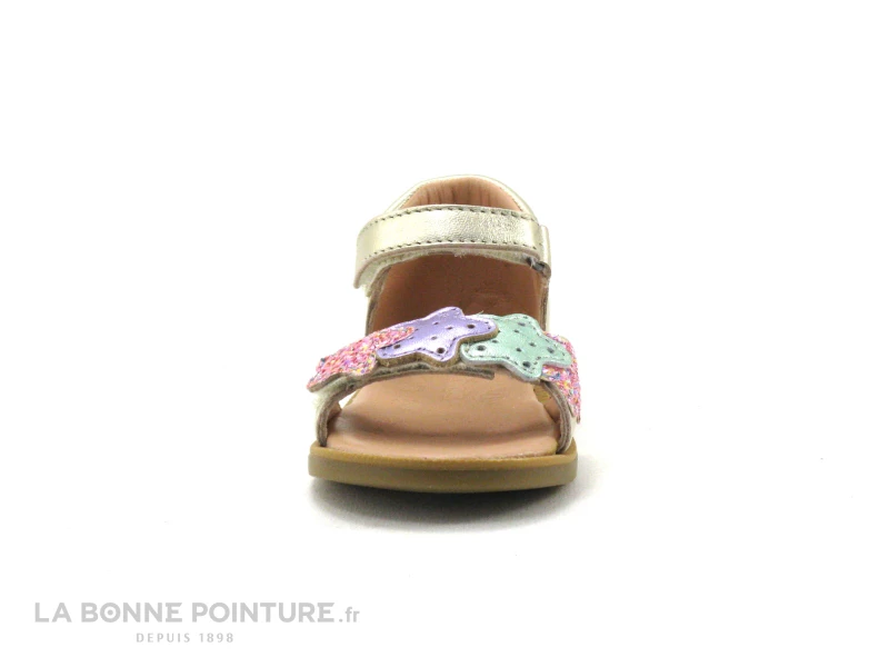Ce nu-pieds premiers pas fille Acebos est en cuir Or métallisé, avec une large bride ornée de 4 étoiles : 2 roses à paillettes, 1 verte et 1 violette.