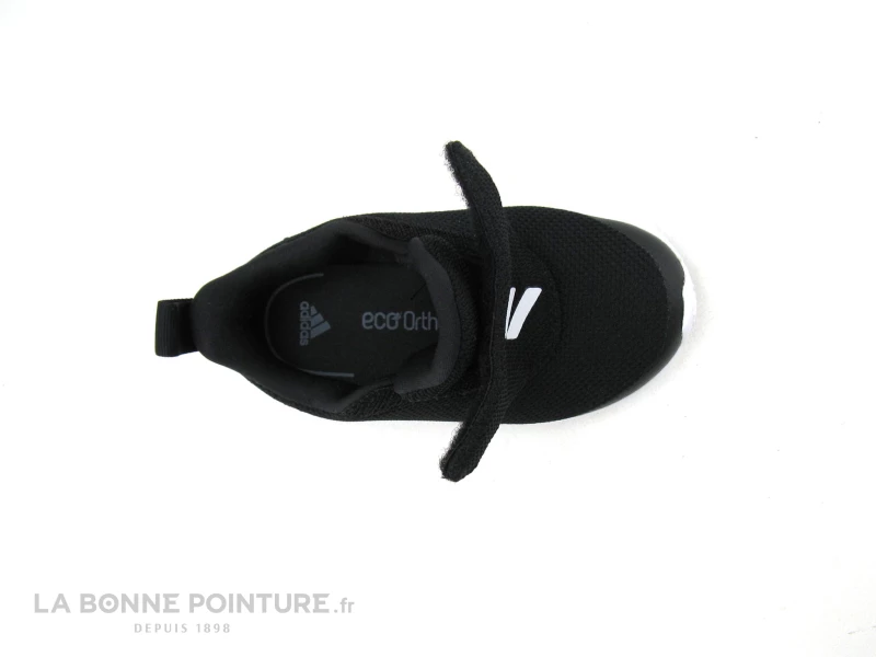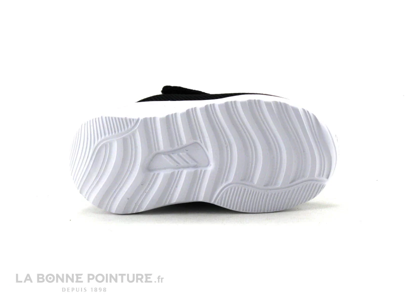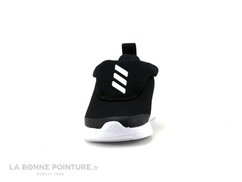 Cette chaussure running bĂ©bĂ© est en textile maille noir, avec la marque Adidas inscrite en blanc sur l’arriĂšre.