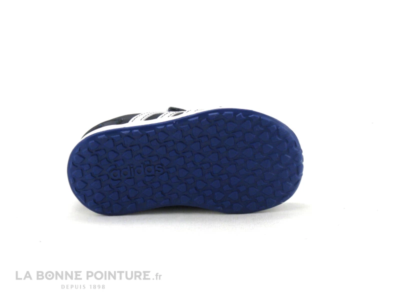 La semelle de marche des chaussures de sport bébé Adidas est souple, blanche avec le dessus bleu.