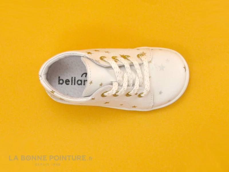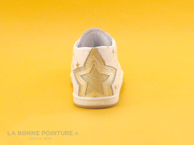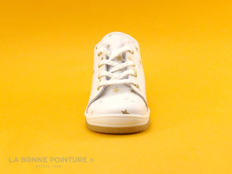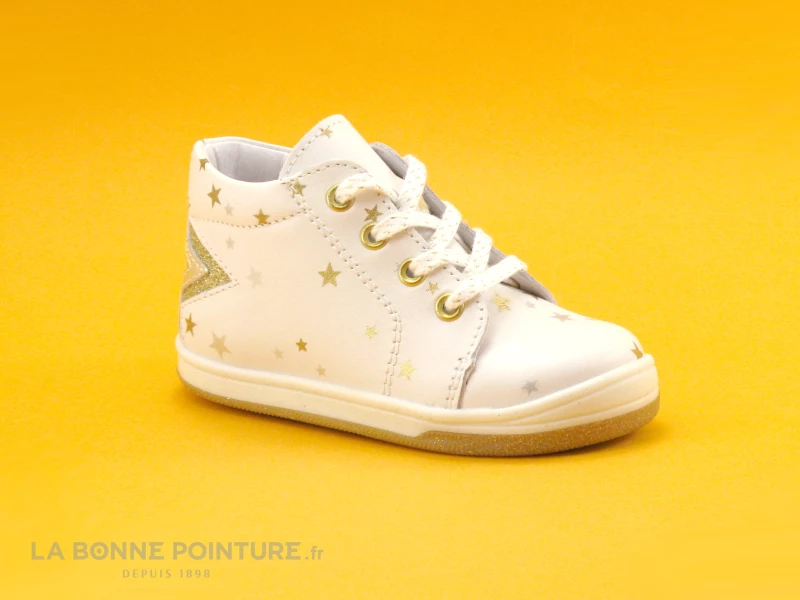Ce bottillon fille est en cuir blanc, parsemé de petites étoiles or et argent. Une grosse étoile habille l’arrière des chaussures, avec des paillettes dorées.