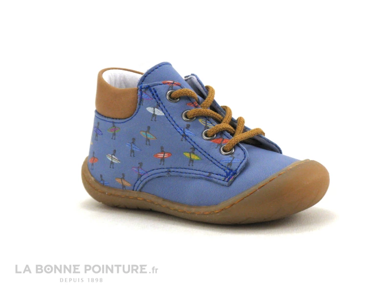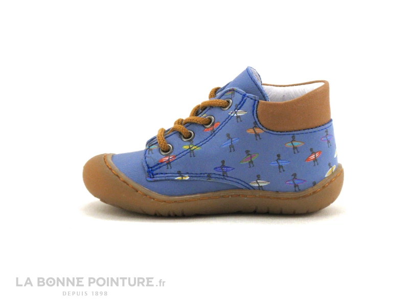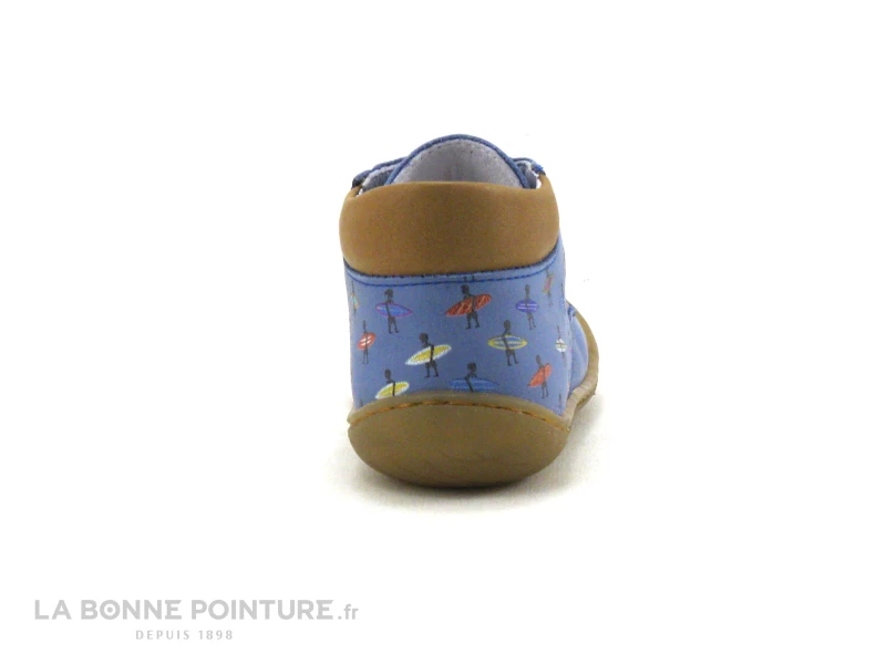 Ces superbes chaussures montantes bébé garçon Bellamy Elvis sont en cuir bleu ciel, parsemé de petits surfeurs de toutes les couleurs. Le tour de cheville matelassé est en cuir marron camel.