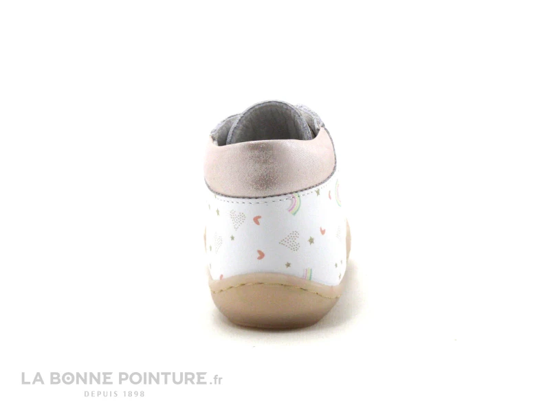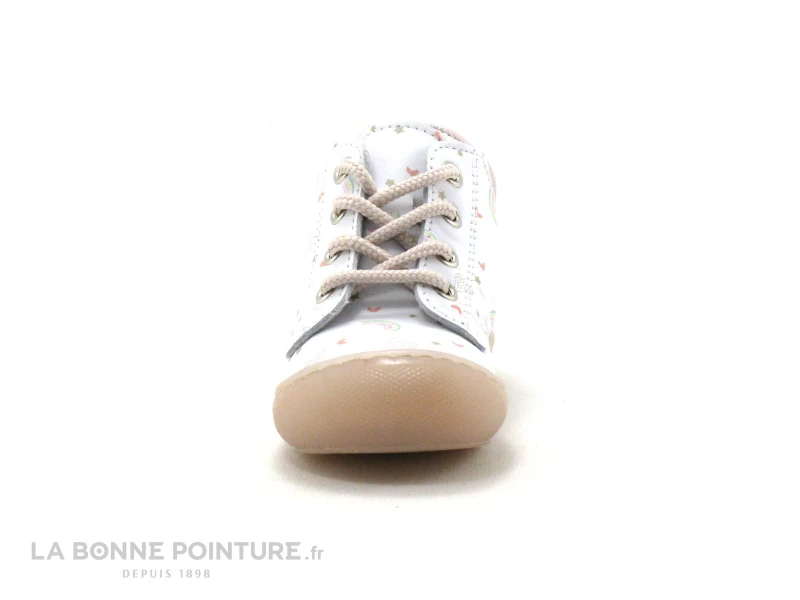 Cette chaussure montante bébé Bellamy est en cuir de grande qualité, blanc parsemé d’arcs-en-ciel, d’étoiles et de petits coeurs…