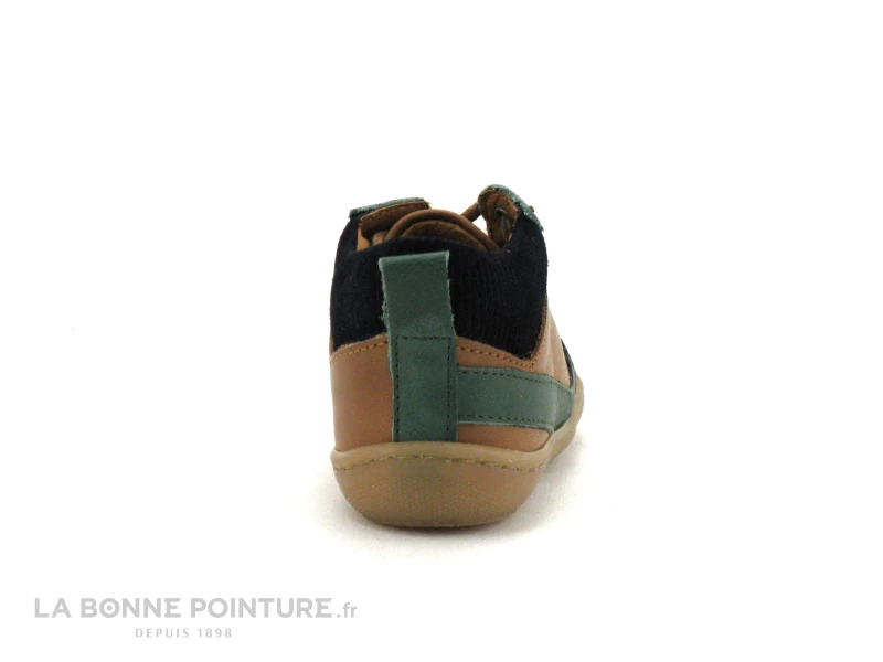 Cette chaussure bébé fabriquée en France Bellamy est en cuir souple marron camel et vert, avec le tour de cheville en cuir velours bleu marine, aspect côtelé.