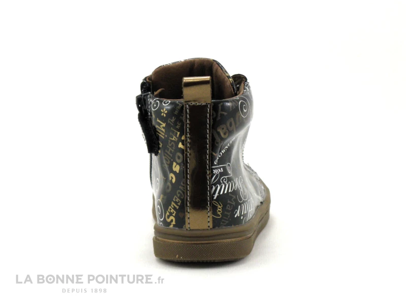 Cette chaussure montante premiers pas est en cuir noir verni, ornée d’écritures, de fleurs et fioritures aux tons d’Or/bronze et d’argent.