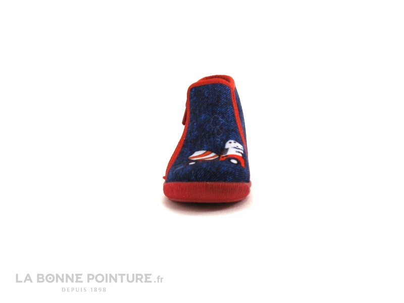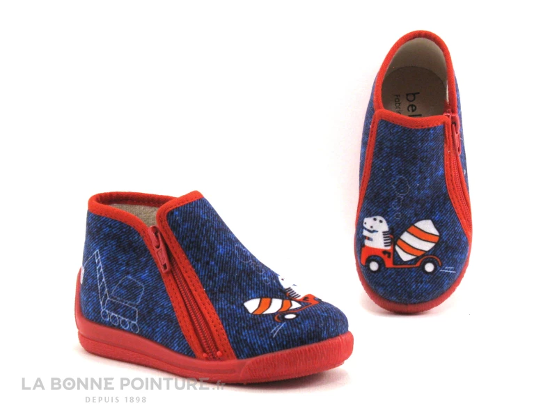 Cette pantoufle enfant Bellamy est en textile velouté bleu jean, avec le pourtour rouge et un camion de chantier sur l’avant.