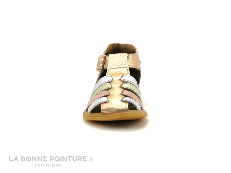 Cette sandale spartiate fille est en cuir métallisé, avec des lanières rose cuivré, argent et or, pour briller tout l’été !