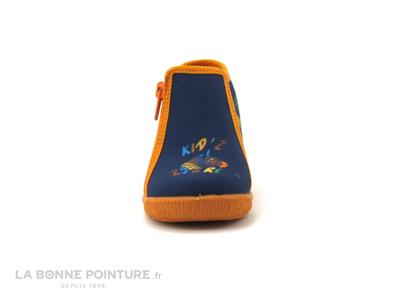 Fermeture facile des pantoufles bébé Bellamy avec la fermeture éclair orange sur le côté.