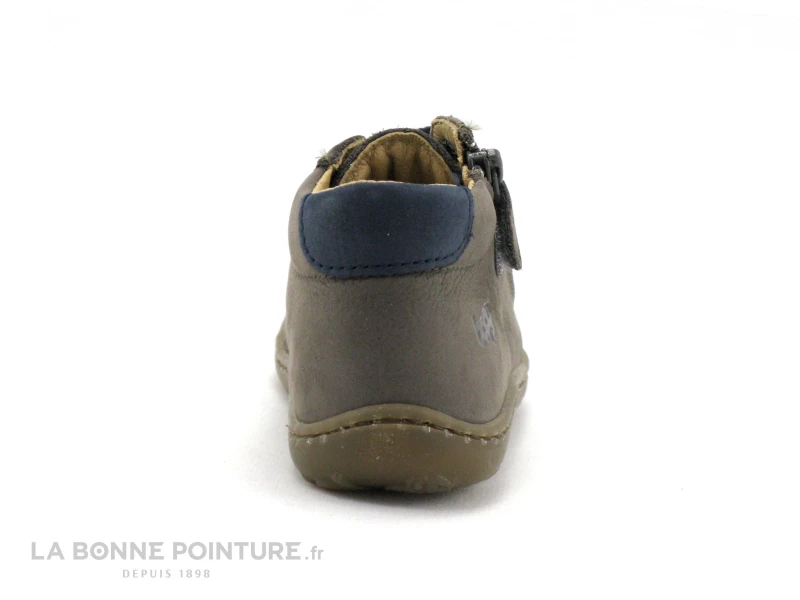 Cette chaussure montante garçon Bopy est en cuir marron taupe aspect peau de pêche, avec une partie bleu marine à l’arrière.