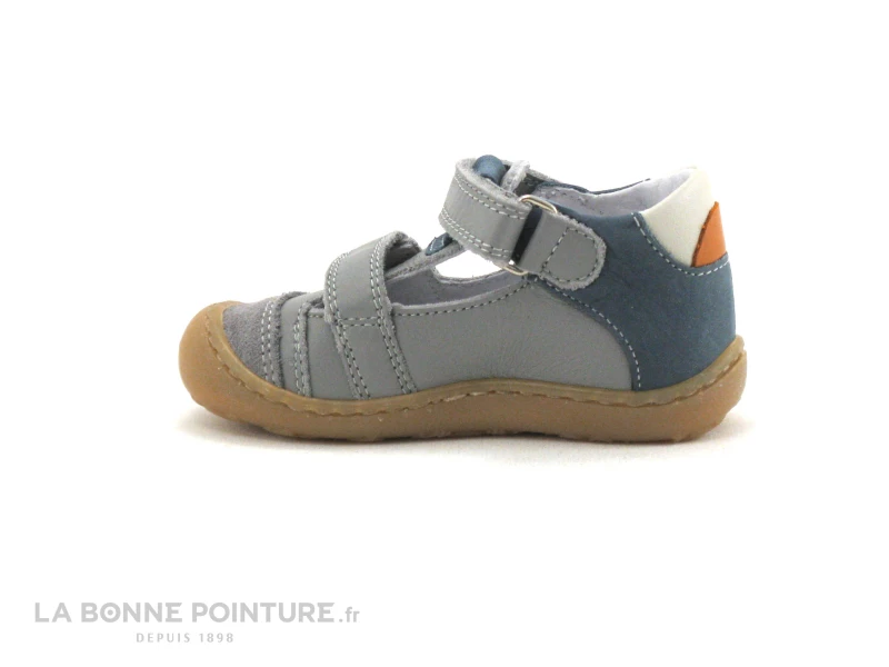 Cette chaussure montante bĂ©bĂ© combine un cuir gris, bleu et orange, avec de petites ouvertures sur les cĂŽtĂ©s pour laisser l’air ciculer autour des petons !