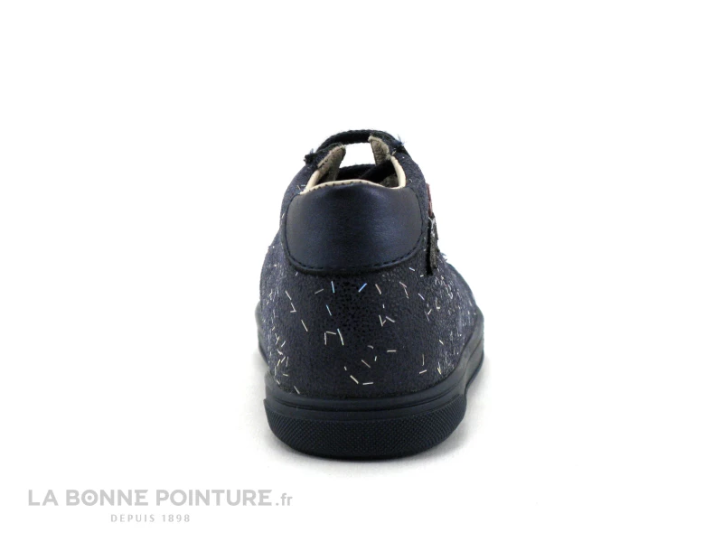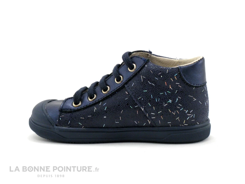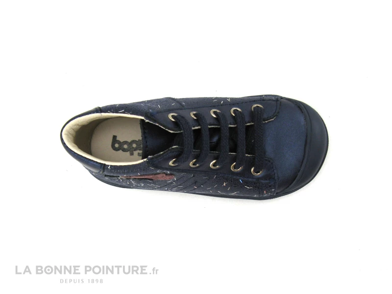Cette chaussure montante Bopy combine un cuir lisse bleu métallisé et un cuir bleu marine parsemé d’une pluie de paillettes argentées…