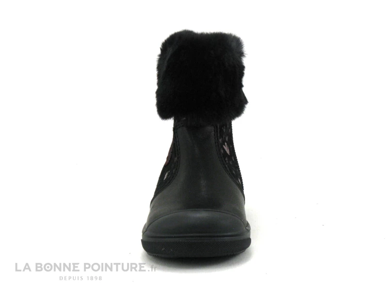 Les bottines fillette en cuir noir Bopy Rosalia avec coeurs roses, des boots fille en cuir avec fourrure à réserver dès maintenant !