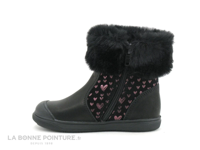 Cette bottine fille Bopy Rosalia est en cuir lisse noir, avec les côtés en cuir velours noir parsemés de petits coeurs rose métallisé.