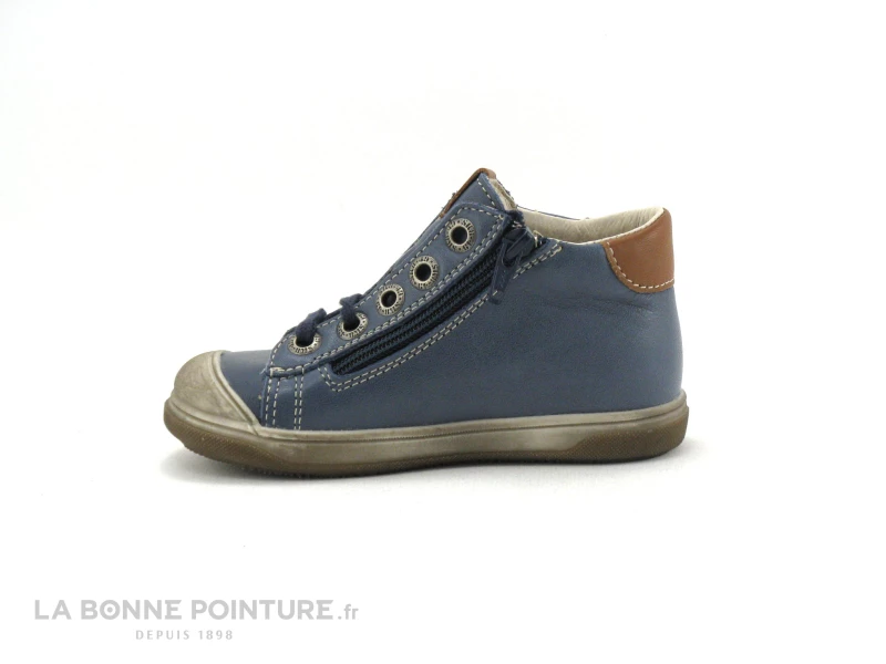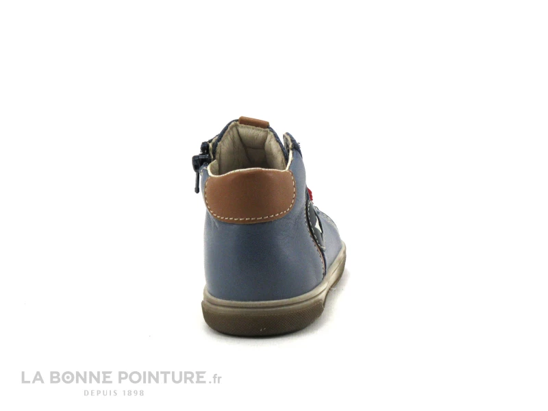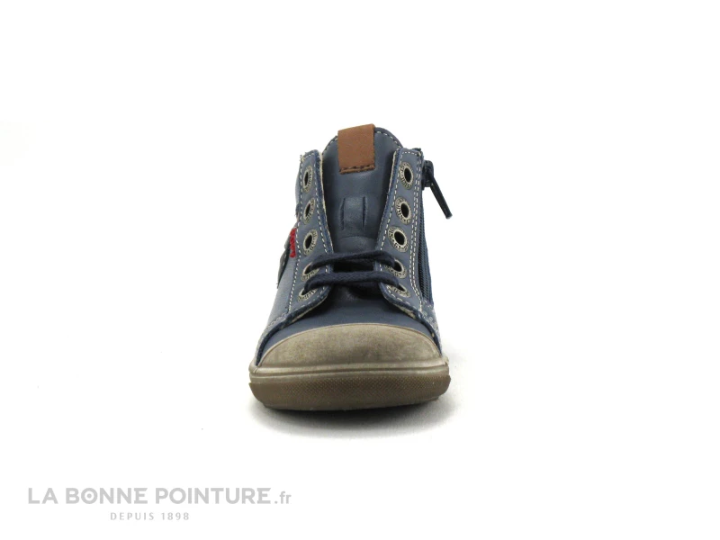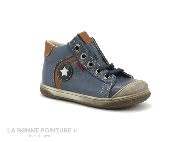 Cette chaussure montante bébé Bopy est en cuir bleu jean, avec une pointe de marron camel et une étoile sur le cÎté.