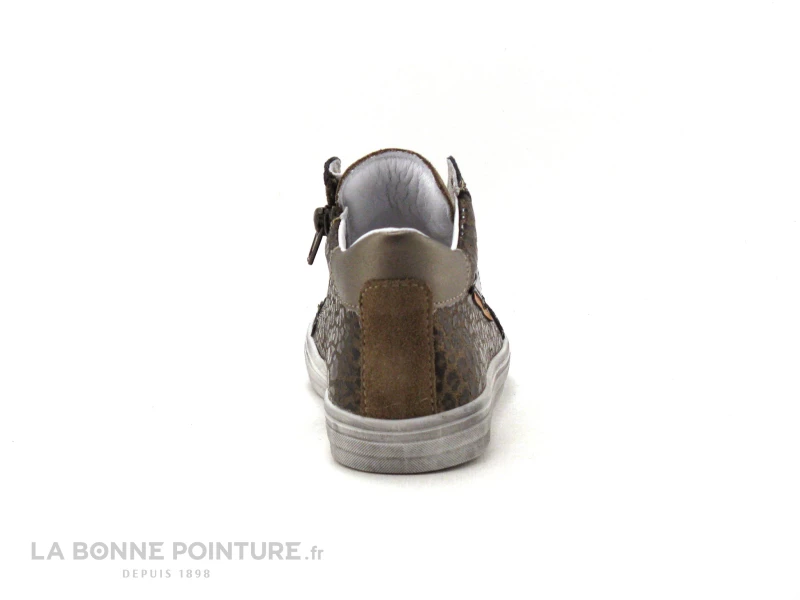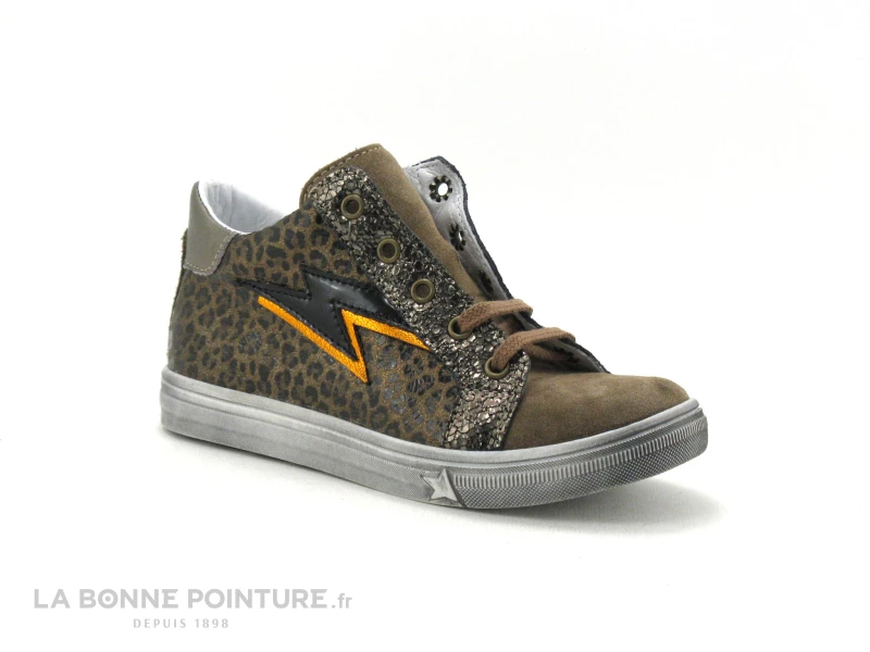 Cette chaussure enfant Bopy mélange harmonieusement un cuir velours marron taupe, un cuir imprimé léopard et un cuir métallisé brillant aspect craquelé.