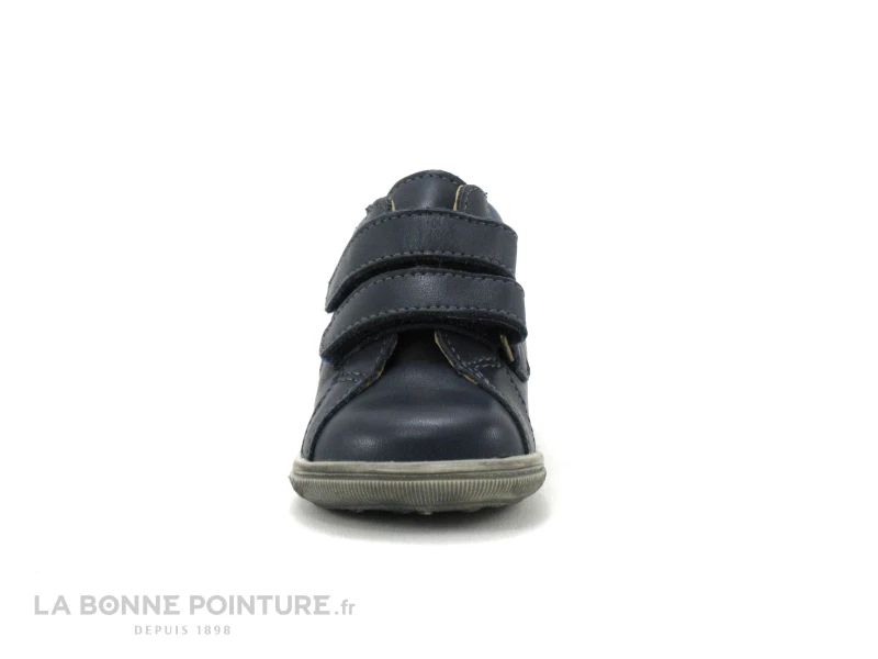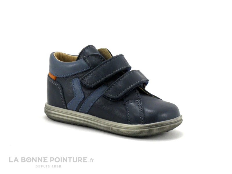 Cette chaussure semi montante bĂ©bĂ© Bopy Zavovel est en cuir lisse bleu marine, ornĂ©e d’un peu de bleu jean et d’orange.