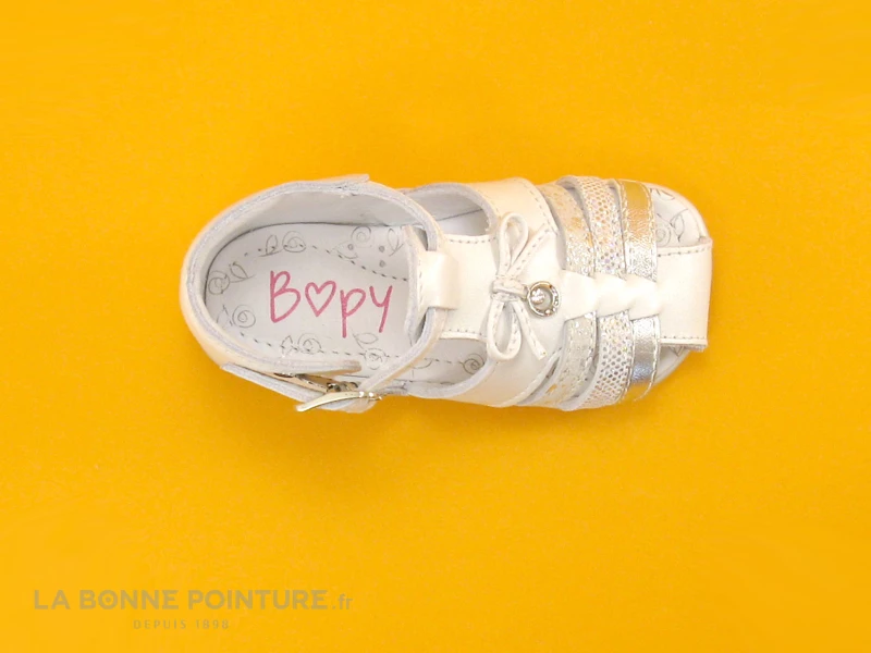 La fermeture du nu-pieds bébé blanc Bopy Zibel s’effectue avec la bride à boucle, réglable sur 5 positions.