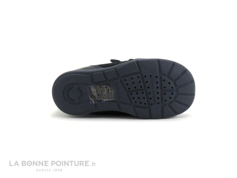 Ce bottillon premiers pas Geox est en cuir et matières synthétiques résistantes bleu marine.