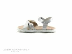 Plein de petits papillons argentés virevoltent sur la tige de la chaussure enfant Geox, un plus gros brille en argent au centre de la sandale.