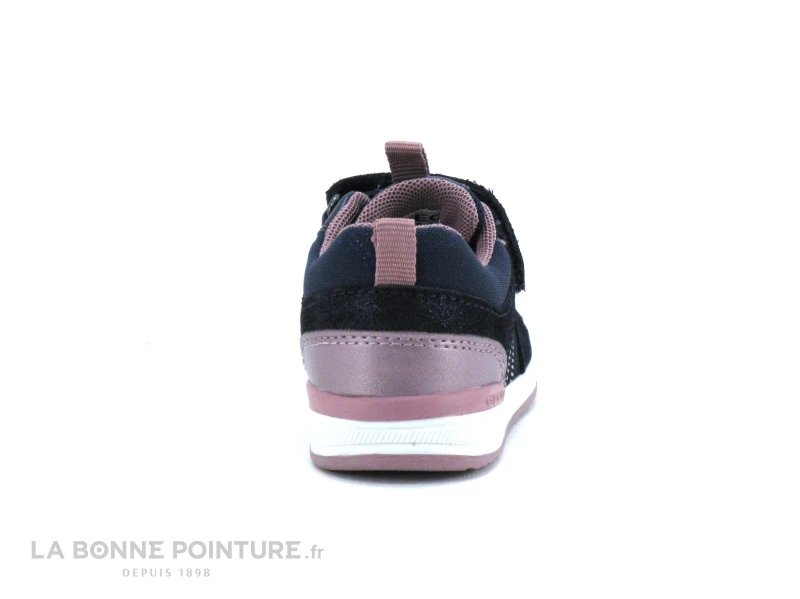 Cette chaussure bébé souple Geox Rishon est en cuir et matières synthétiques résistantes bleu marine, avec des parties pailletées et rose métallisé.