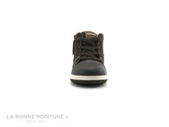Cette chaussure montante enfant premier prix est en textile et matières synthétiques marron et noir.