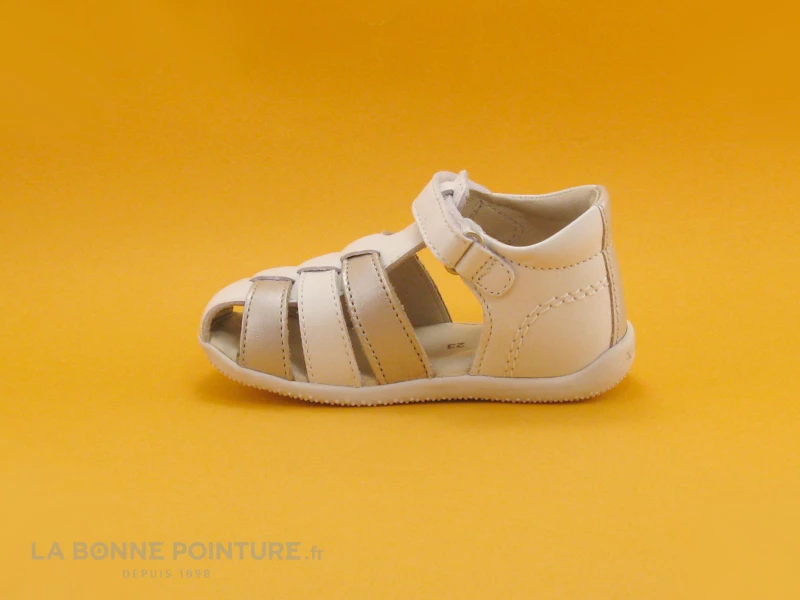 Cette sandale montante bébé fille combine un cuir blanc et un cuir beige nacré.