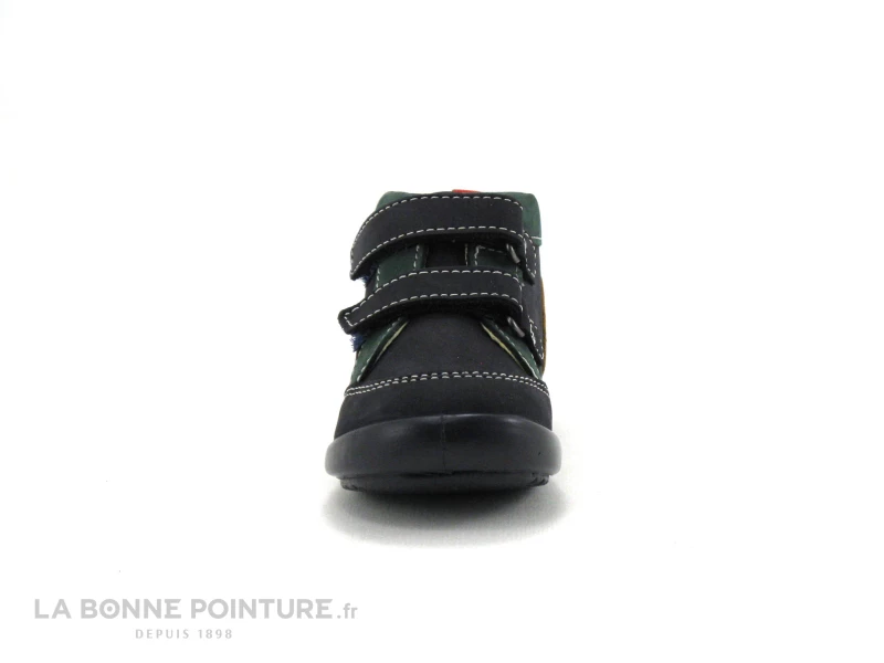 Ces belles chaussures montantes bébé garçon Kickers Kinop sont en cuir velouté bleu marine, avec un peu de vert et de jaune.