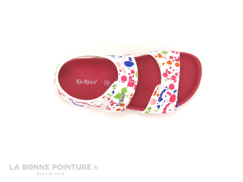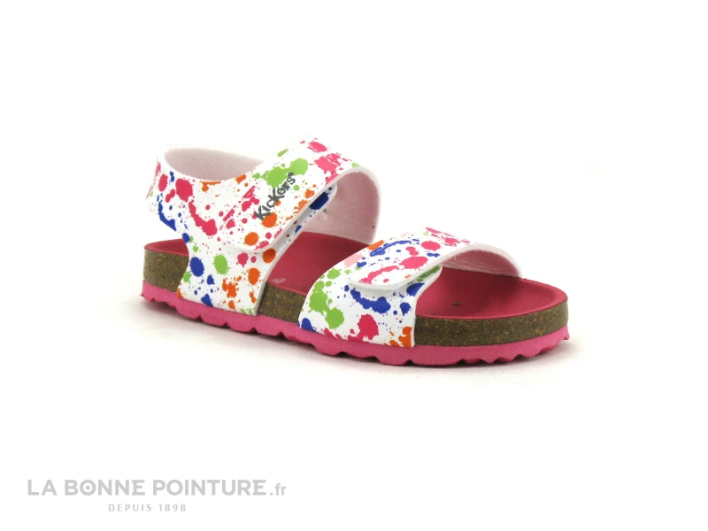 Ce nu-pieds fille Kickers est imprimé de petites taches de peinture multicolores sur fond blanc.