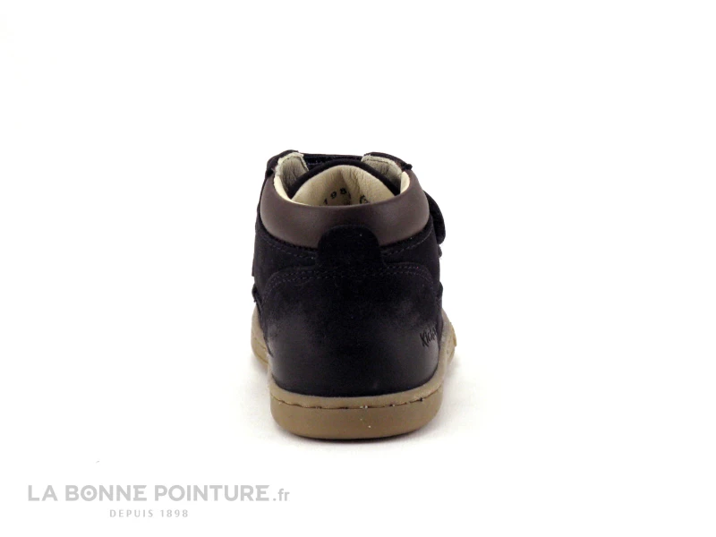 Cette chaussure montante Kickers Ă velcro est en cuir velours bleu foncĂ©, avec les extrĂ©mitĂ©s lisses et l’encolure marron chocolat.