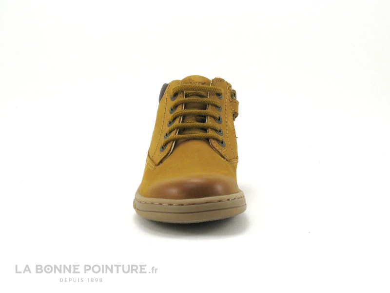 Cette chaussure montante garçon Kickers est en cuir aspect peau de pêche marron clair (camel), avec la pointe et le contrefort plus foncés.
