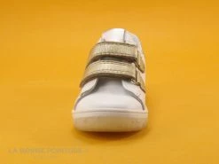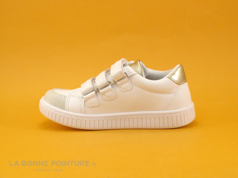 Cette basket fille Kouki by Bopy est blanche avec la languette dorée et la pointe veloutée beige.