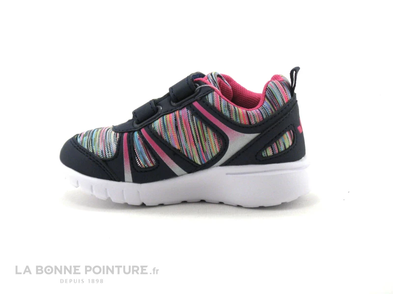 Cette basket fille est en textile et matières synthétiques, bleu marine avec des rayures multicolores et argentées.