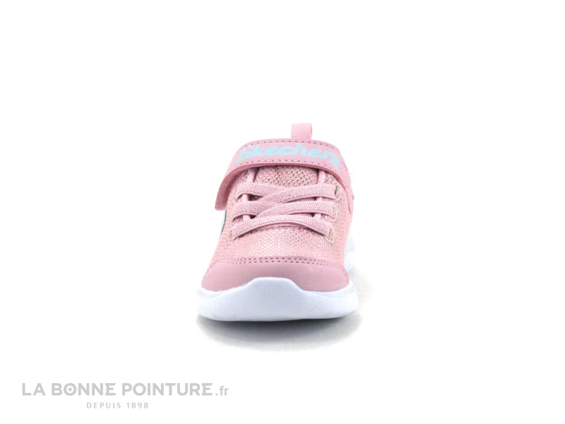 Le lacet élastique rose permet d’enfiler rapidement la chaussure bébé Skechers Easy Peasy. Fermeture aisée avec la bride à velcro.