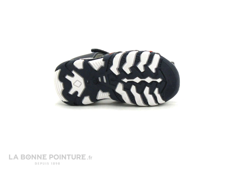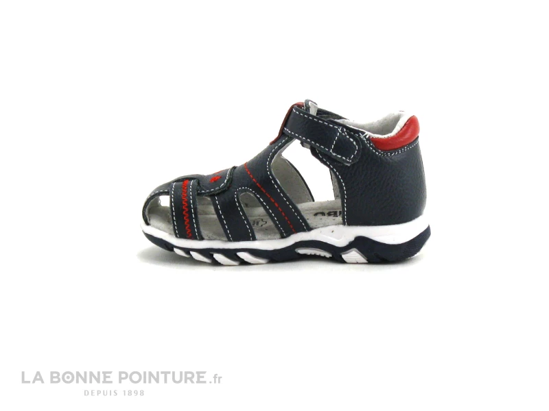 Cette sandale enfant est en cuir grainé bleu marine, avec des empiècements et des coutures rouges.