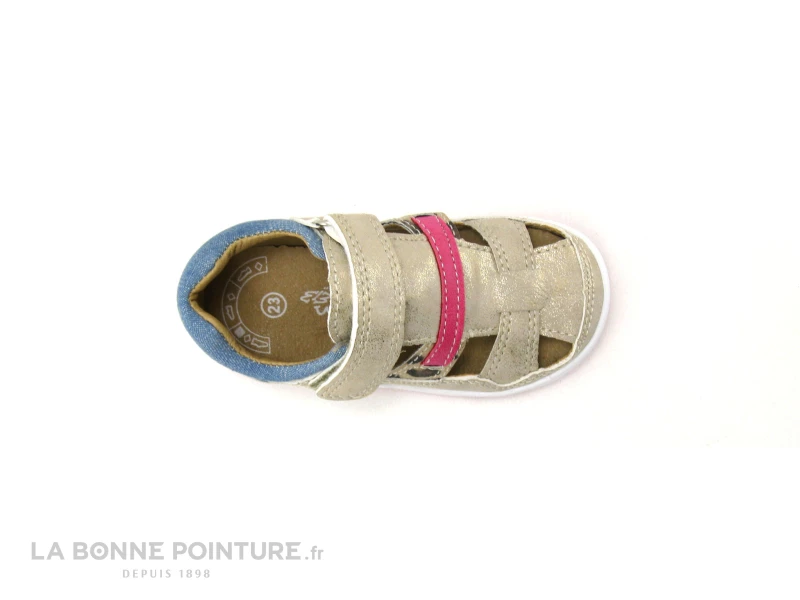 Ce nu-pieds fille à bout fermé est beige métallisé, avec des parties rose framboise, bleu jean et léopard.