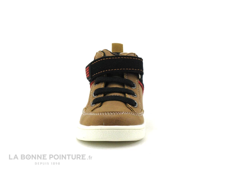 Ce bottillon bébé Wipop est marron camel, avec l’arrière noir et un liseré rouge sur le côté.