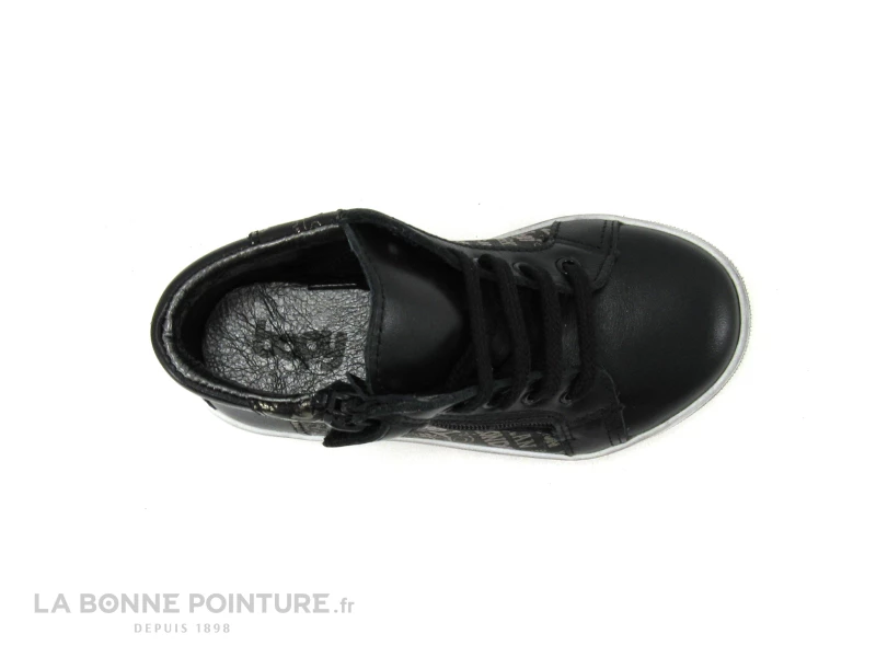 Cette basket montante fille Bopy mélange un cuir lisse noir avec un cuir imprimé or sur les côtés.