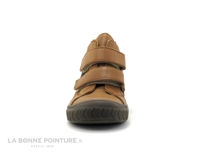 Cette chaussure montante enfant Bopy est en cuir lisse marron caramel, ornée d’une étoile bleu marine sur le côté externe.