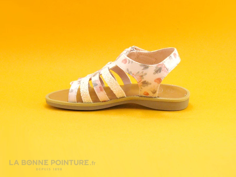 Ce nu-pieds spartiate enfant est blanc imprimé de fleurs aux tons de rose et de vert, avec des lanières pailletées.