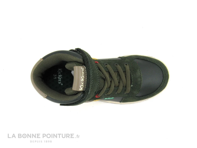 Cette basket montante enfant Kickers mélange cuir velours et matières synthétiques résistantes aux tons de kaki, de jaune et de beige.