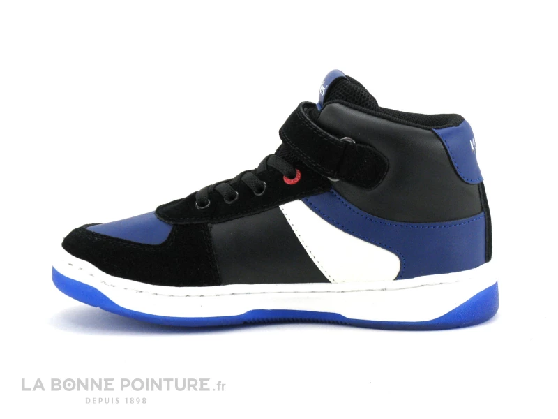 Cette chaussure montante enfant Kickers associe cuir et matières synthétiques résistantes aux tons de noir, de bleu royal et de blanc.