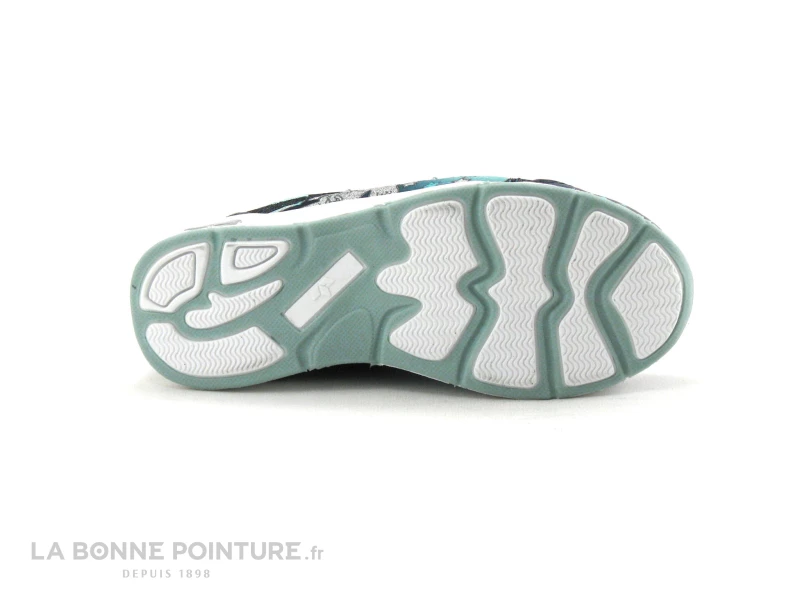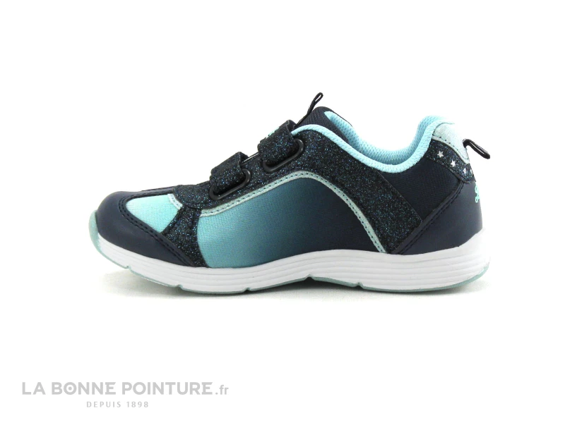 Cette tennis clignotantes fille est bleu marine et turquoise, avec des parties pailletées et une licorne argentée sur le côté externe de la chaussure.