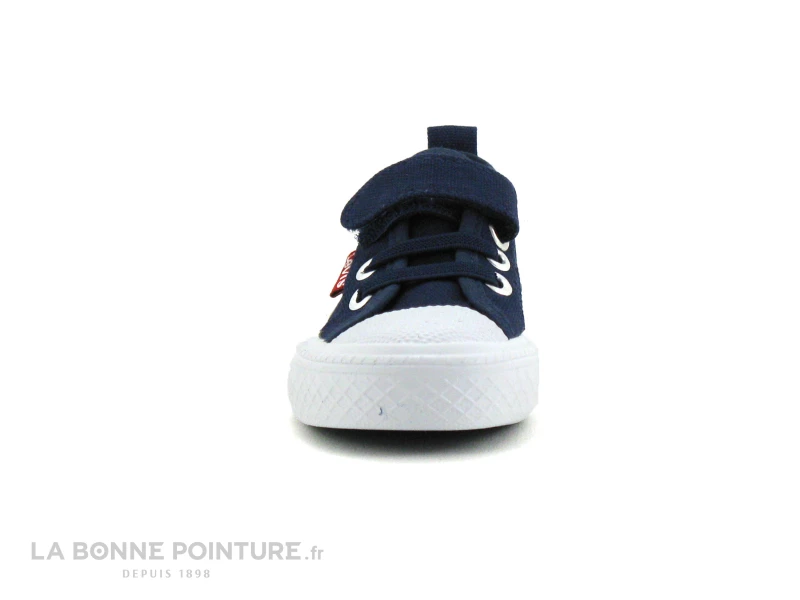 Le lacet Ă©lastique bleu marine permet d’enfiler facilement la chaussure bĂ©bĂ© Levis, qui se ferme avec la bride velcro.