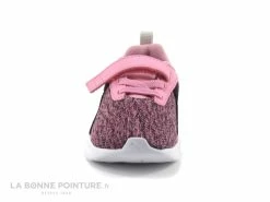Cette paire de baskets enfant à petit prix est en simili cuir blanc, avec des touches rose brillant et argent.