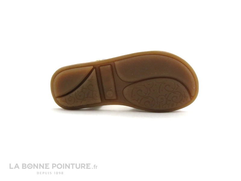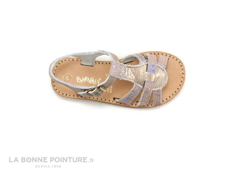 Ce nu-pieds spartiate fille combine un cuir métallisé beige/bronze et un cuir velouté rose nude aux reflets multicolores.